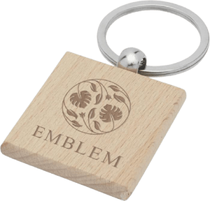 Squared keychain made of beech wood, supplied into a brown recycled Kraft paper envelope. The size of the keychain is 4 x 4 cm. Made for laser engraving. Beech wood. Branding is done by way of laser engraving.